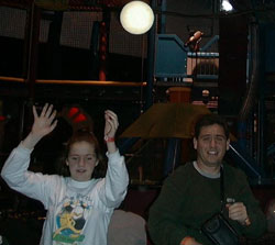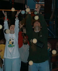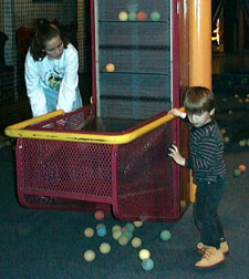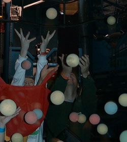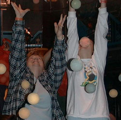 Ana and Marty are catching the many foam balls that fall from reservoirs above the arena. It is really hard to catch them this way! |