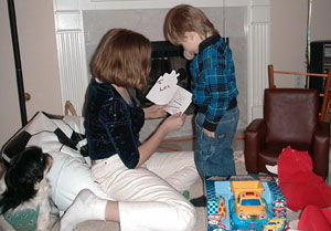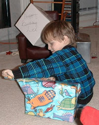 Lex opening his birthday presents. Rod insisted that he should get to do the honors, so he had to sit by Dad on the couch. |
