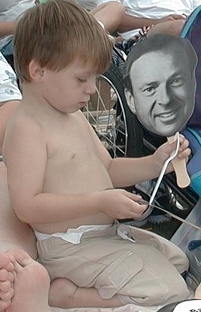 Lex was playing with fans they handed out to the crowds. He was very intent on a project, who knows what he was planning to do with that spoon. |